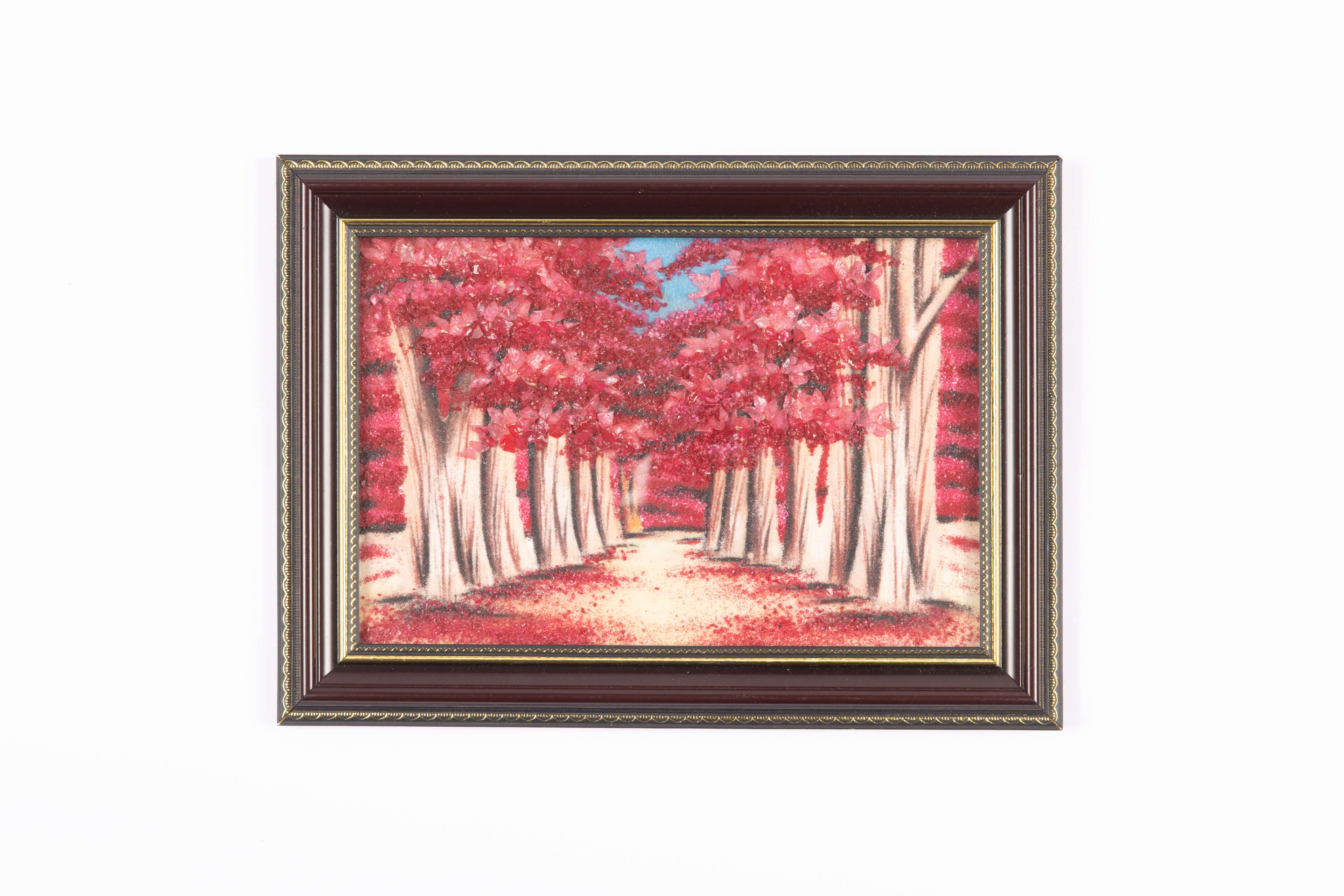 越南的刺繡技術聞名國際,已有700年歷史,其作品常以生活所見為主題,舉凡植物、水牛、雞、農婦等,反映越南純樸、清雅的景況。越南的刺繡畫被譽為「布上的繪畫」,一針一線都需要工匠精心製作;但也由於越南手工刺繡費工費時、做工精美,故價格不斐。此掛畫上的杏花也別具深意,在越南,杏花多盛開於生機勃勃的春天,引申為祝福他人,在新的一年裡花開富貴、鴻運當頭。